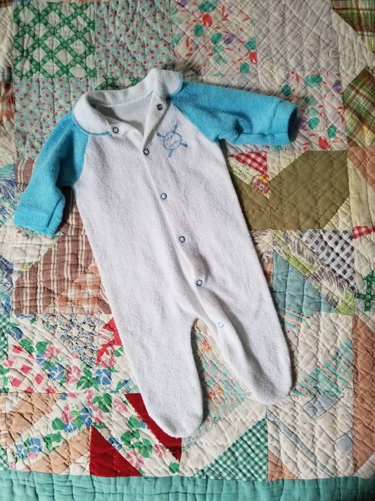 Vintage sleeper, medium terry cloth white blue baseball snaps long sleeves footed collar polyester boy newborn pajamas baby shower gift