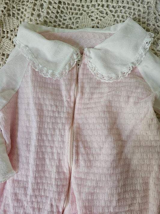 Vintage sleeper, newborn baby infant girl pink long sleeves footed zipper collar rosettes lace trim pajamas baby shower gift retro nursery