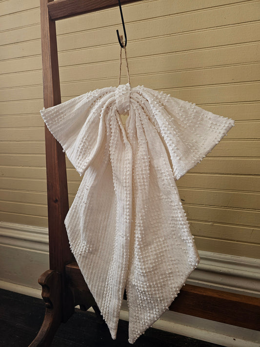 Handmade bow, white chenille vintage fabric door decor large wreath upcycled neutral farmhouse shabby granny chic Easter springtime summer
