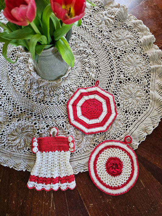 Vintage potholders, set of 3 handmade crocheted white red floral medallion spider web dress 50s kitsch retro kitchen decor trivets country