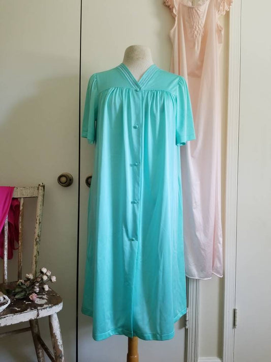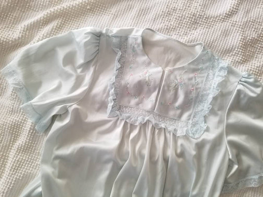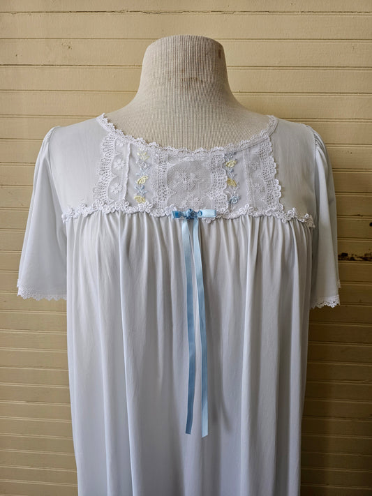 Vintage nightgown, Adonna medium blue short sleeves below knee scoop neck lace trim embroidered floral sheer soft nightie pajama dress nylon