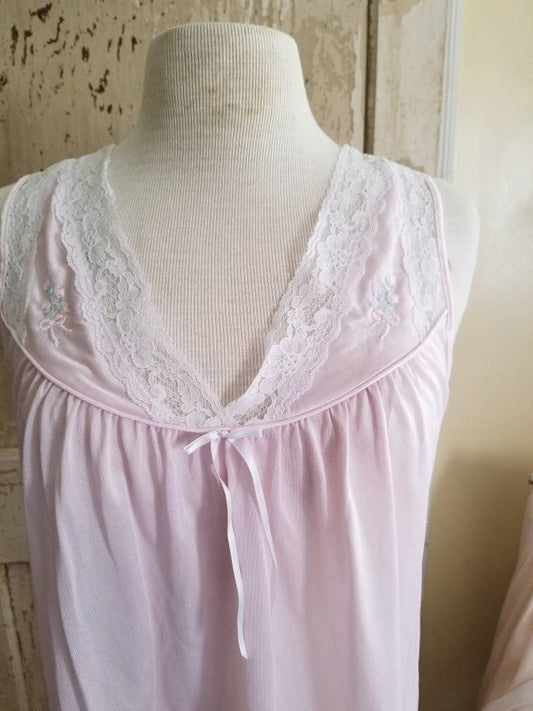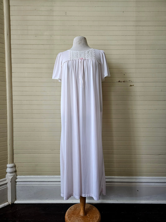 Vintage nightgown, Adonna pink short sleeves below knee medium scoop neck nylon white lace trim bow rosette sheer soft flowy