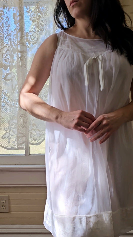 Vintage nightgown, Sears medium 36 white sheer lace peignoir nightie babydoll lingerie 60s sleeveless above the knee scoop neck