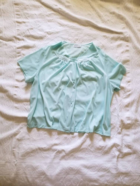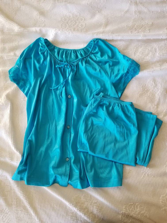 Vintage pajama set, Lorraine large blue two piece top pants lingerie short sleeves ankle length nylon elastic waist 40 button up loungewear