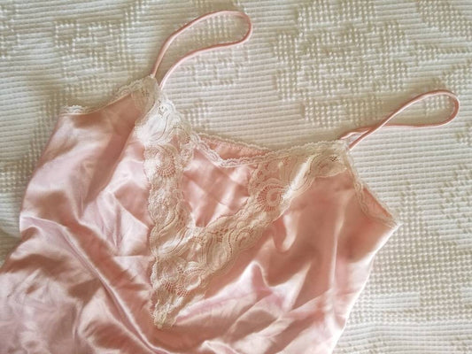 Vintage Pink Camisole / Escapades / Cami Lingerie Top / Sexy Spaghetti Straps / Liquid Satin Cami / Small / White Lace