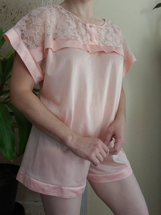 Vintage Pink Pajama Set / Jill Andrea / Medium / Shorts Set / Nylon / Lace / Top Set / Short Sleeves / Pajamas / Sleep Set / PJs / Lingerie