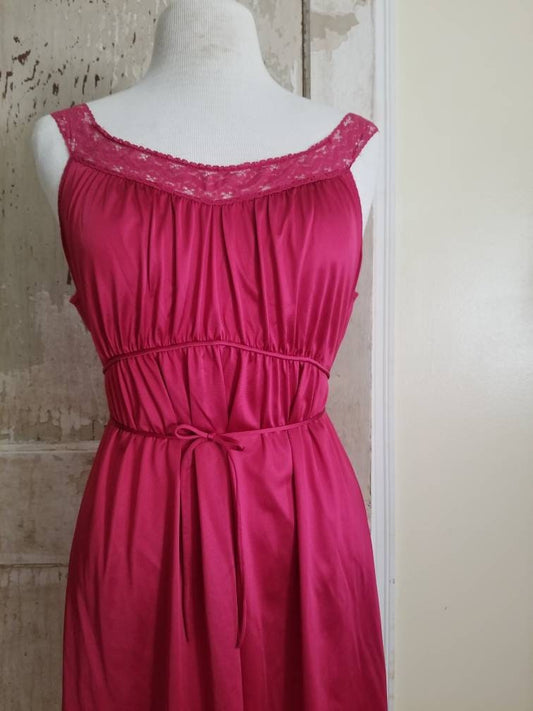 Vintage Nylon Nightgown / Vanity Fair / Medium / Magenta / Cranberry / Lace / Grecian / Wrap Ties / Short / Knee Length / Sexy / Scoop Neck