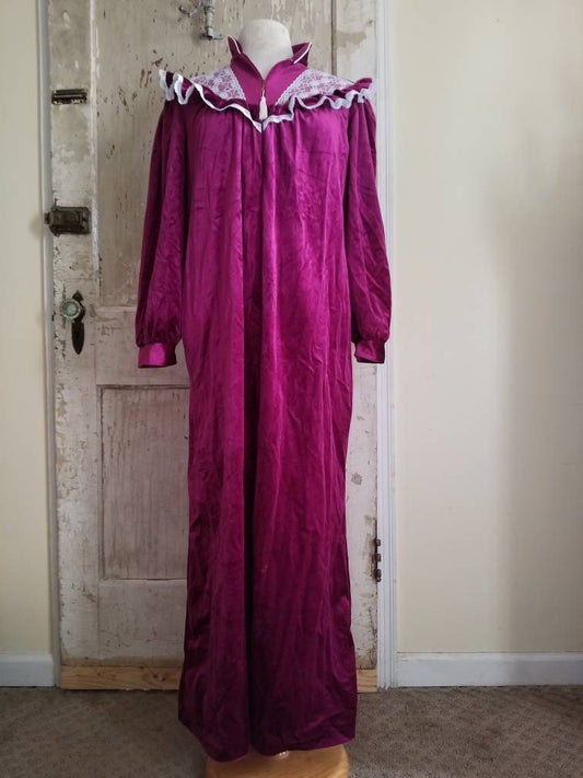 Vintage robe, Vandemere, S, M, plush, crushed velvet, magenta, lace, long sleeves, warm, long, ankle length, 70s 80s, dynasty, loungewear
