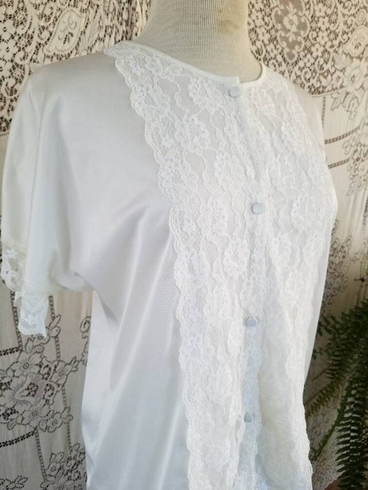 Vintage pajama set, white, top, pants, lace, floral, short sleeves, granny chic, nylon, cottage core, buttons front, elastic, small, ankle