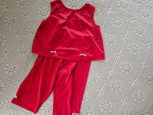 Vintage pajama set, Sans Sauci 36 two piece top pants loungewear red sleeveless capri length small medium lingerie nylon Chinese frog bow
