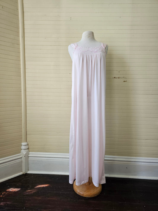 Vintage nightgown, pink long maxi ankle length sleeveless peignoir embroidered floral clouds lingerie scallop edges sheer 70s silky nylon