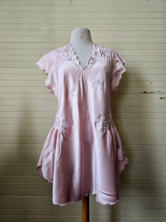 Vintage nightgown, Natori large pink nightie babydoll lingerie short sleeve embroidered floral scallop romantic feminine silky satin 70s 80s
