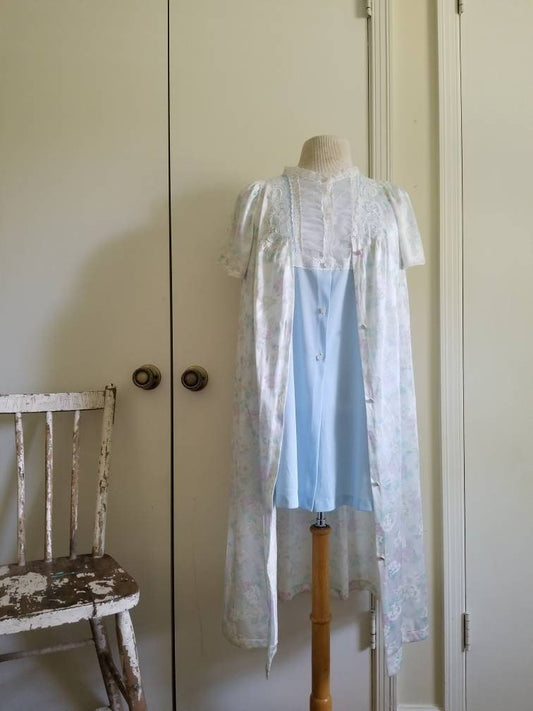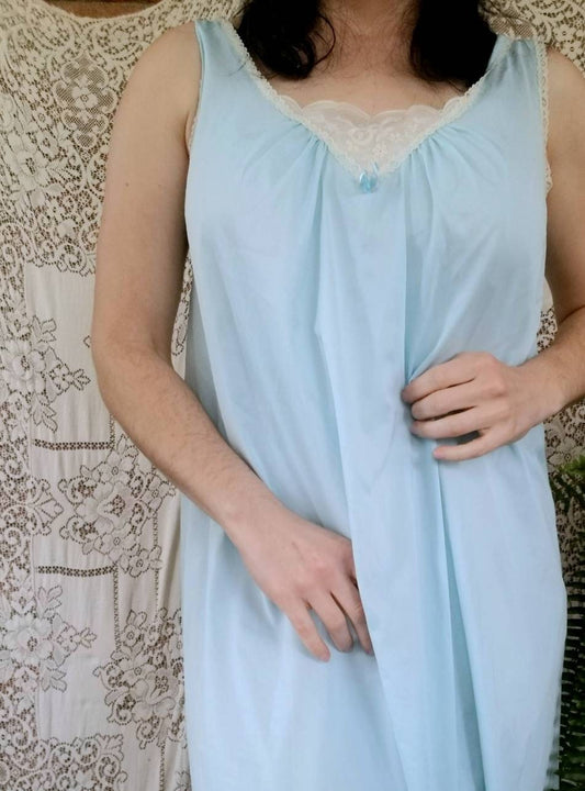 Vintage nightgown, Vanity Fair, SML, one size, blue, sleeveless, lace, floral, knee length, granny chic, cottagecore, peignoir, nylon