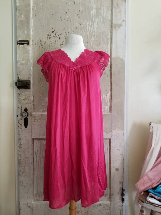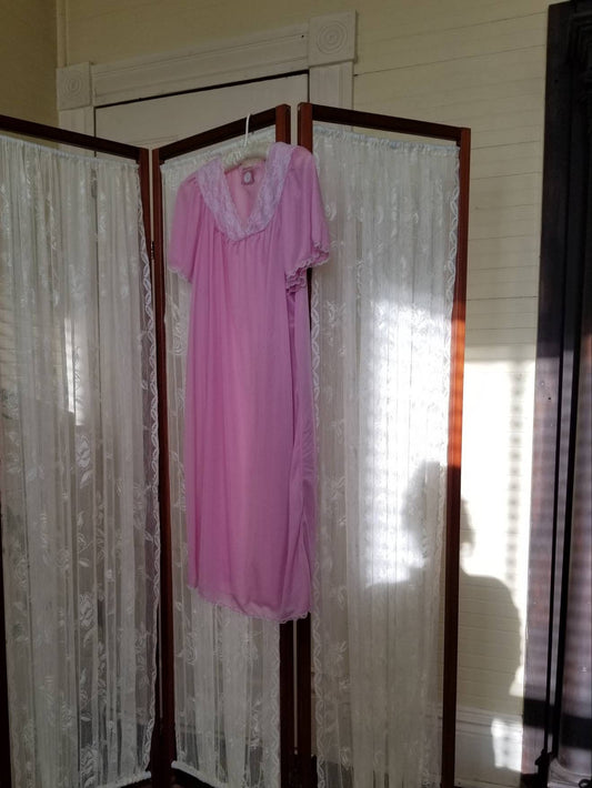 Vintage nightgown, Corollo Collection, medium, pink, short sleeves, lace trim, knee length, polyester, 80s, v neckline, flowy, sheer