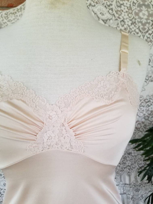 Vintage camisole, Vassarette 36 pink nylon cami tank top lingerie half slip lace trim v neck princess seams floral shoulder straps
