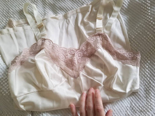 Vintage camisole, half slip, nude, beige, adjustable straps, Pinehurst Lingerie, lingerie, lace trim, 32, 70s, sexy, tank top, sleeveless