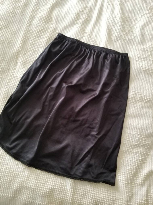 Vintage half slip, black, Vassarette, small, lingerie, mini, short, elastic waist, 19" length, lace trim, above the knee, skirt slip, nylon