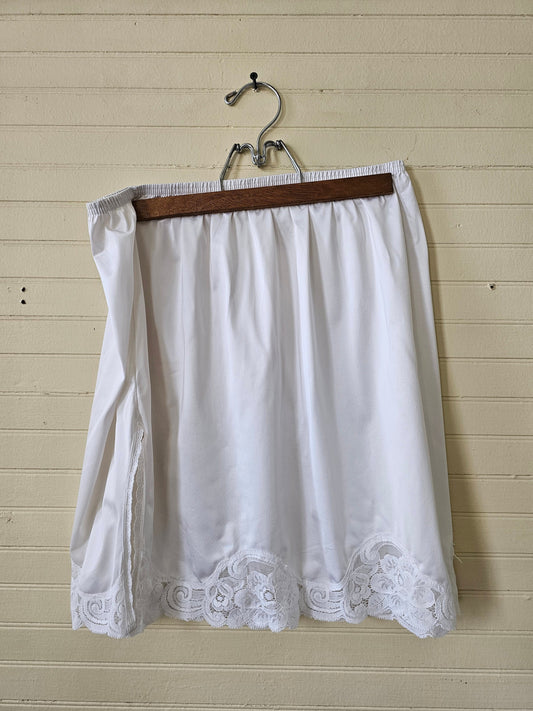 Vintage slip, Vanity Fair 42 large skirt mini short white leg slit lace trim elastic waist 18" long nylon lingerie women intimates half slip