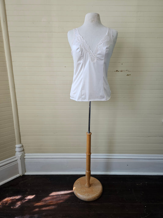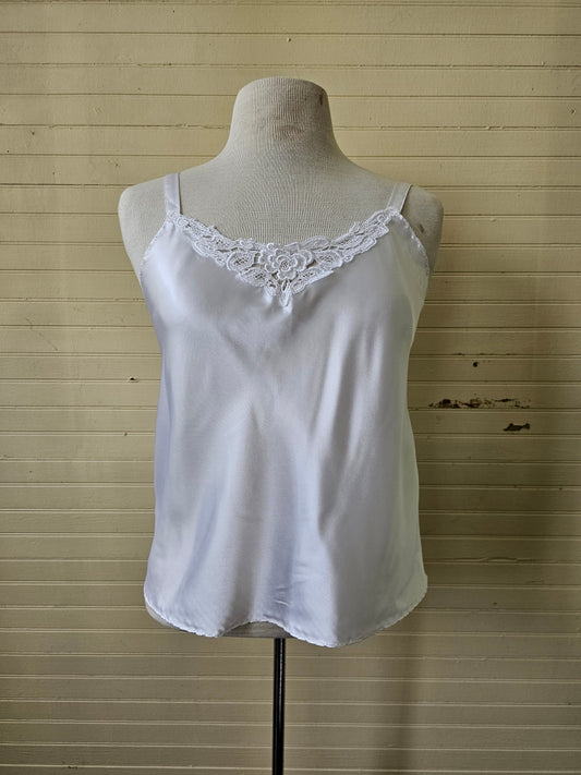 Vintage camisole, white cami lingerie floral lace trim thin shoulder straps tank top modesty slip scoop neck undergarment feminine girly