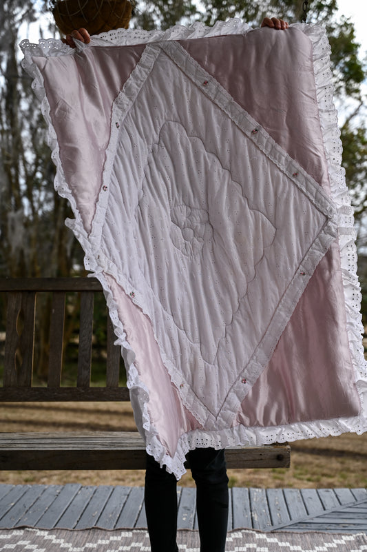 Vintage baby blanket, baby infant girl white pink feminine eyelet lace silky trim rosettes quilted patched thick warm cottagecore Victorian style baby shower gift