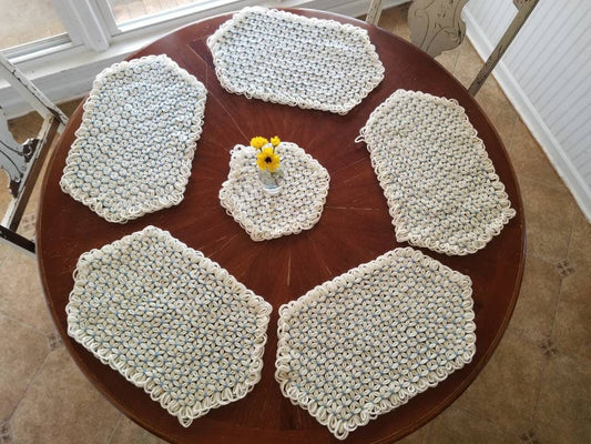 Vintage table setting, set of 16 placemats coasters white oval round crochet lace trim embroidered floral romantic feminine country farmhouse cottagecore granny chic shabby chic