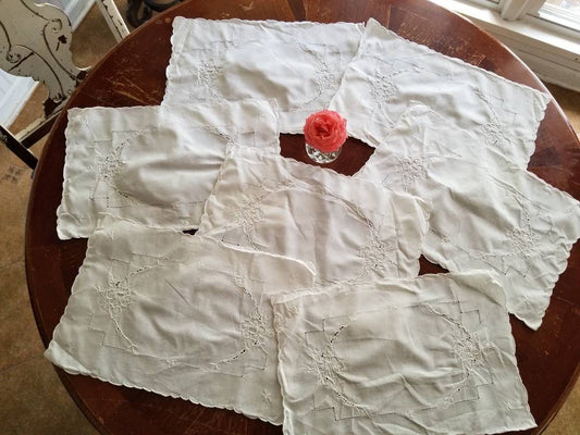 SALE Vintage placemats, set of 7, white, floral, lace, embroidered, cutwork, granny chic, grandmillennial, cottagecore, Victorian, shabby chic