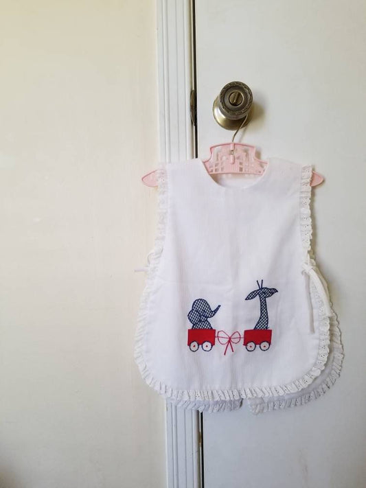 SALE Vintage pinafore, apron dress embroidered circus train open sides 60s 70s toddler girl fashion