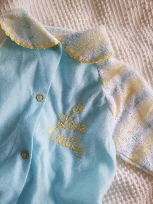 SALE Vintage sleeper, I love Daddy, gender neutral, infant, boy, bodysuit, pajamas, PJs, 6-9 months, 70s, collar, snaps, footed, blue, yellow