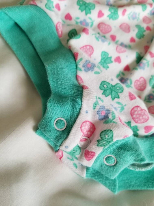 SALE Vintage Teal Romper / Cuties by Judy / 6-9 m / Baby Girl / Jumper / Jumpsuit / Bubble / Cotton Knit / Short Sleeves / Hearts / Bows / Kawaii