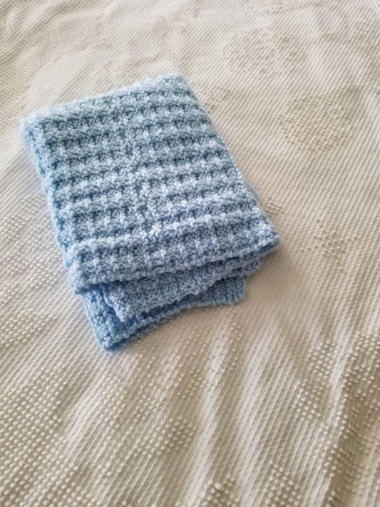 SALE Vintage blanket, baby handmade knit crochet blue newborn boy crib bedding baby shower gift gender reveal 35 x 25