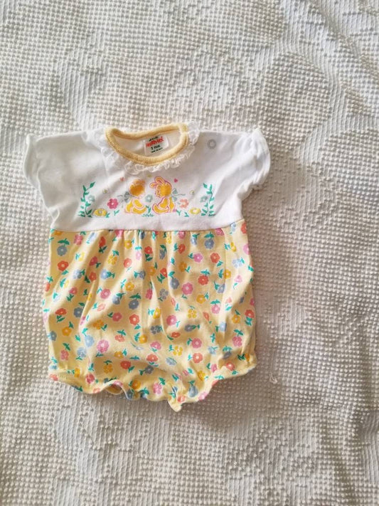 SALE Vintage Yellow Romper, infant, baby, girl, Health-Tex, 3m, bear, bunny, floral, flowers, lace trim, short sleeves, crotch snaps, bodysuit