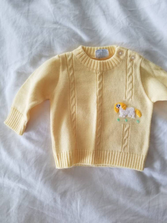 SALE Vintage sweater, Nann Knits, baby, infant, 0-6m, yellow, dog, long sleeves, shoulder buttons, cable knit, 50s 60s, unisex, gender neutral