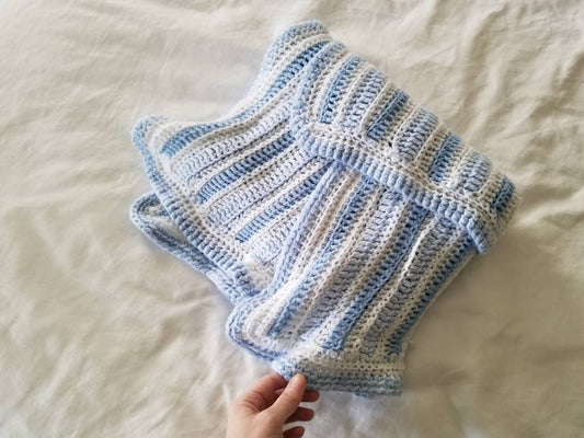 SALE Vintage blanket, crochet, blue, white, stripes, handmade, baby shower gift, infant boy, throw, crib bedding, nursery, pastel, large, acrylic