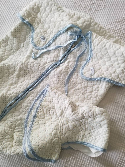 SALE Vintage baby bunting, Kozee Komfort, set of 2, carrier, papoose, bonnet, hat, polka dots, blue, white, infant, boy, zipper, 50s 60s, newborn
