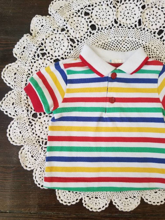 SALE Vintage shirt, baby infant boy girl gender neutral stripes collar short sleeves knit 70s 80s blue green red yellow white snap buttons