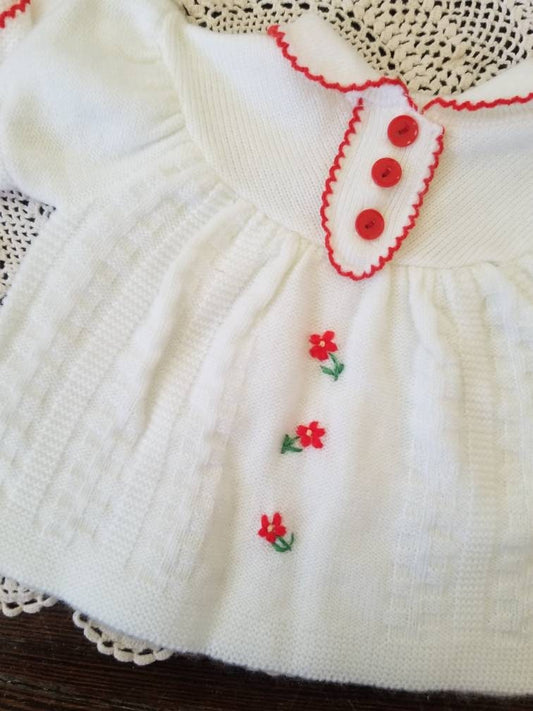 SALE Vintage sweater, 3 months baby infant girl short sleeves knit white red embroidered floral 70s 80s scallop trim buttons warm cosy pullover