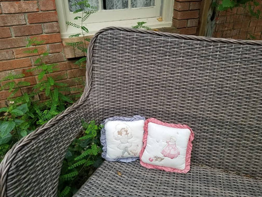 SALE Vintage pillows, nursery decor, crib bedding, quilted, embroidered, small, square, ruffle trim, toddler, child, infant, girl, pink, blue