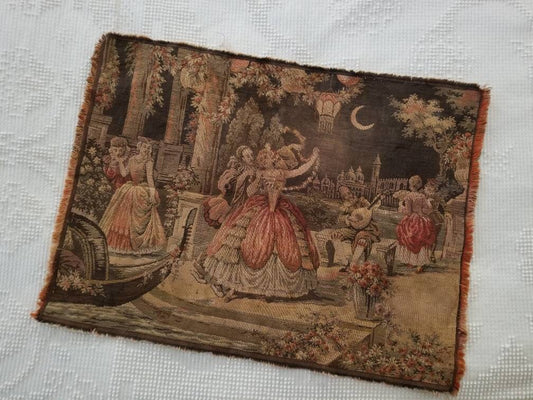 SALE Vintage tapestry, wall hanging, courtship, couple, dancing, music, love, decor, textile, landscape, floral, woven, romantic, gondola, Venice