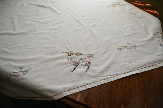 Vintage tablecloth, embroidered small square Chinese paper lanterns florals table topper white pastel colors Asian Oriental handmade