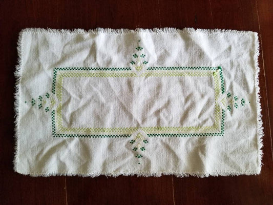 SALE Vintage table runner, embroidered, table linen, white, green, handmade, doily, rectangle, art deco, placemat, fray edge, boho, bohemian