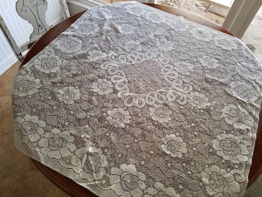 SALE Vintage tablecloth, lace, topper, small, square, off white, floral, rose, granny chic, shabby chic, cottage core, table linen, romantic