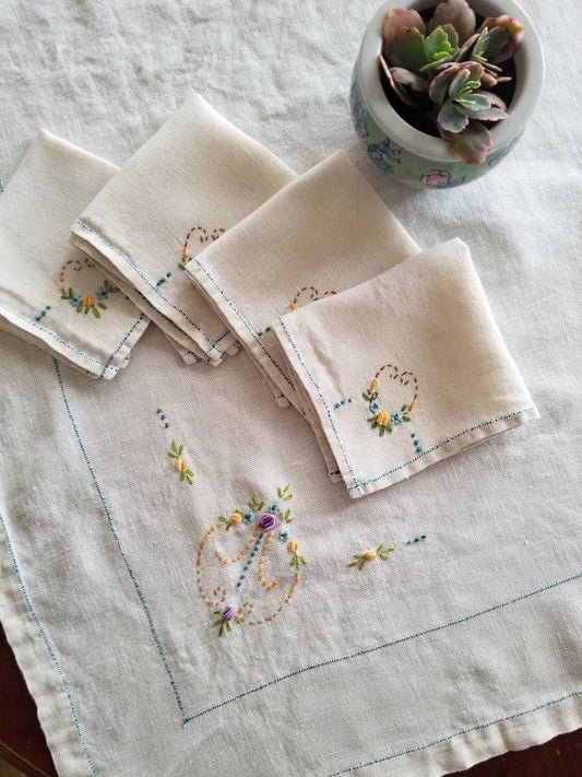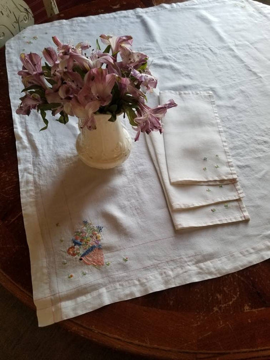 Vintage table linens, set of 4 tablecloth napkins luncheon hand embroidered garden florals lady gardener granny shabby cottagecore square