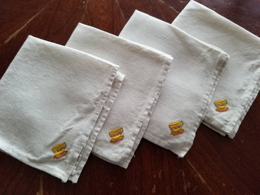 SALE Vintage table linens, set of 5, tablecloth, napkins, tea pot, teacups, shabby chic, granny chic, cottagecore, grandmillennial, embroidered