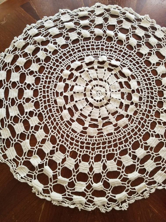 SALE Vintage tablecloth, crochet, handmade, white, spiderweb, circle, medallion, table topper, small, round, granny chic, shabby chic, Victorian