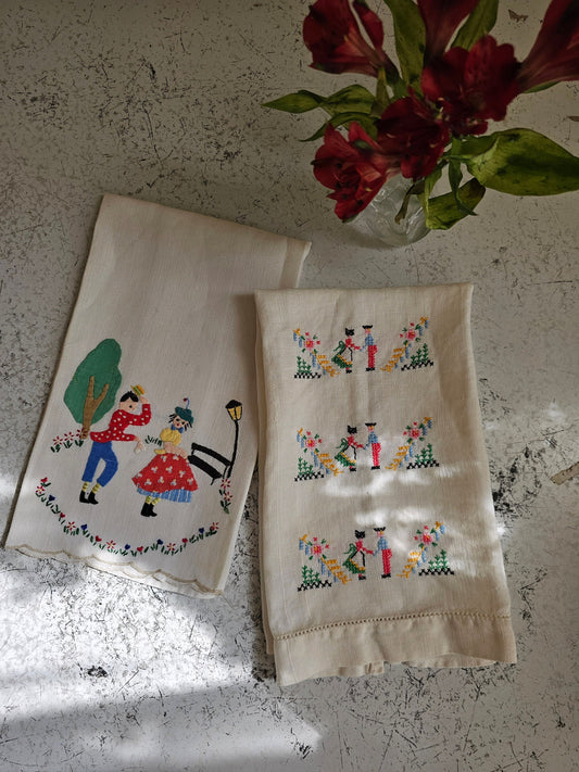 Vintage hand towels, set of 2 handmade embroidered applique floral couple lovers his hers dutch charming cottagecore shabby granny chic