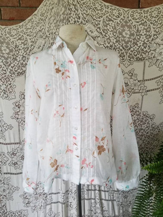 Vintage blouse, 13/ 14, floral, sheer, long sleeves, tab collar, button up front, pleated, white, 70s, pink, brown, blue, feminine, shirt