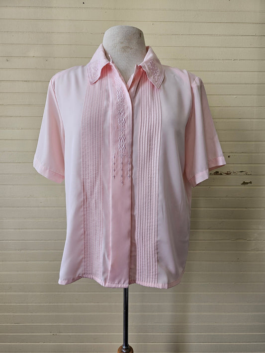 Vintage blouse, Claudia Richard 10p pink short sleeves button up front embroidered floral pleated fancy dressy flowy collar shoulder pads 90
